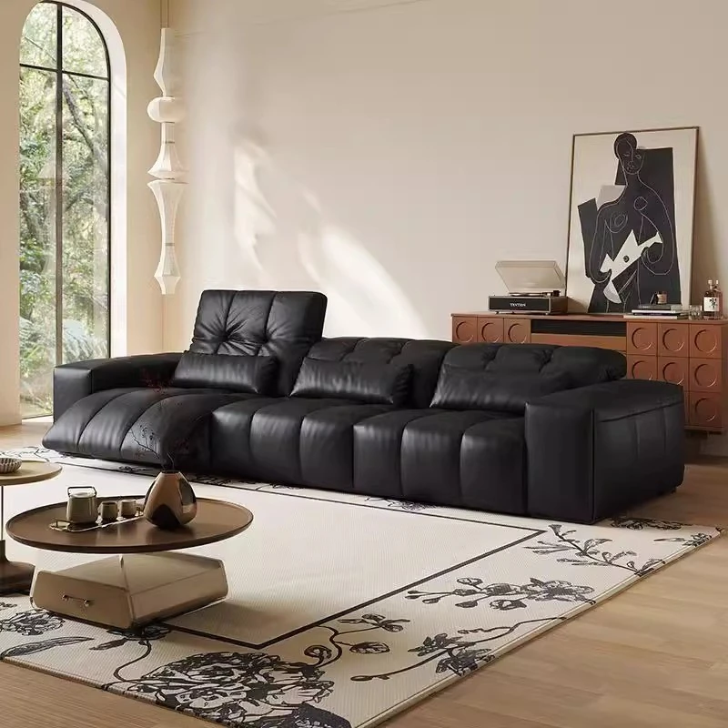 Adjustable Electric Retro Italian Space Capsule Sofa - Pixel Black Genuine Leather Couch for Living Room, Perfect for Wall-Free Spaces