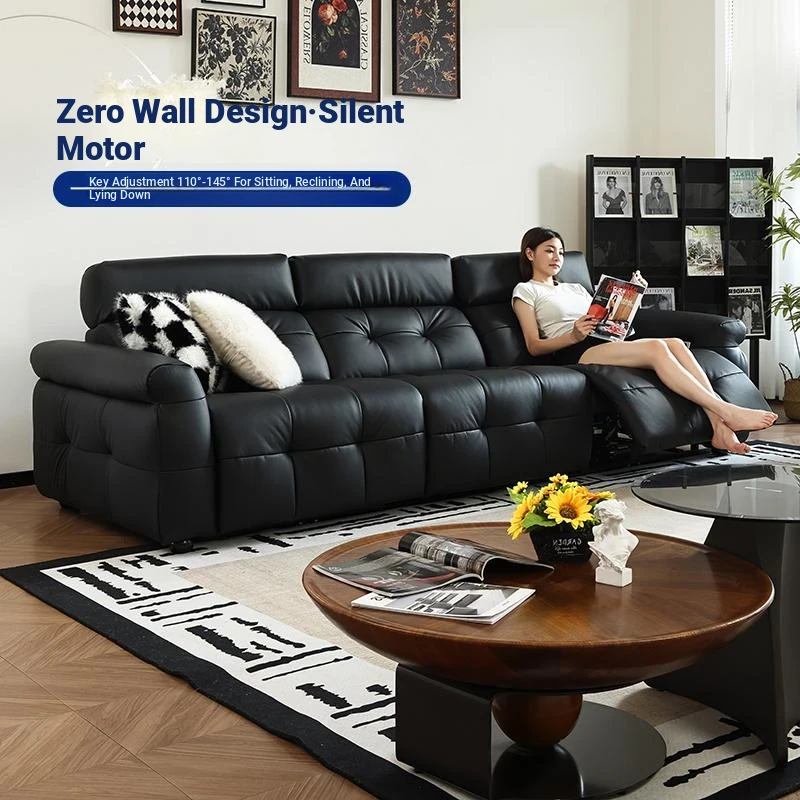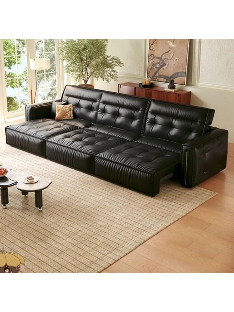 Adjustable Electric Leather Sofa Bed - Retro Multi-Function Black Genuine Top-Grain Leather Couch for Living Room, Space-Saving Design Perfect for Wall Placement