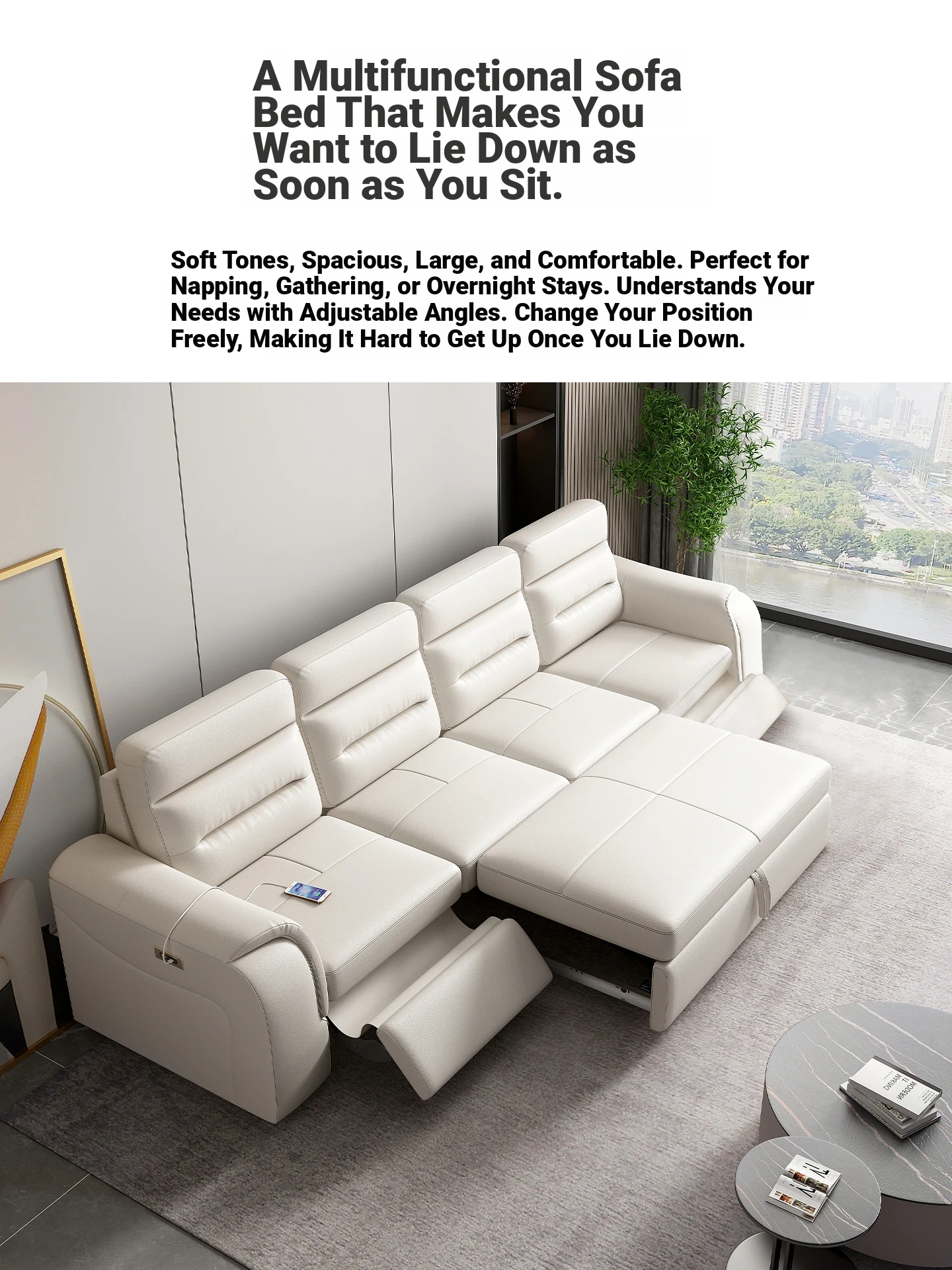 Shiloni Electric Multifunctional Sofa - Cream-Colored Thick Genuine Leather, Wall-Hugging Design for 3-4 People, Straight-Line Style with Pull-Out Bed Feature
