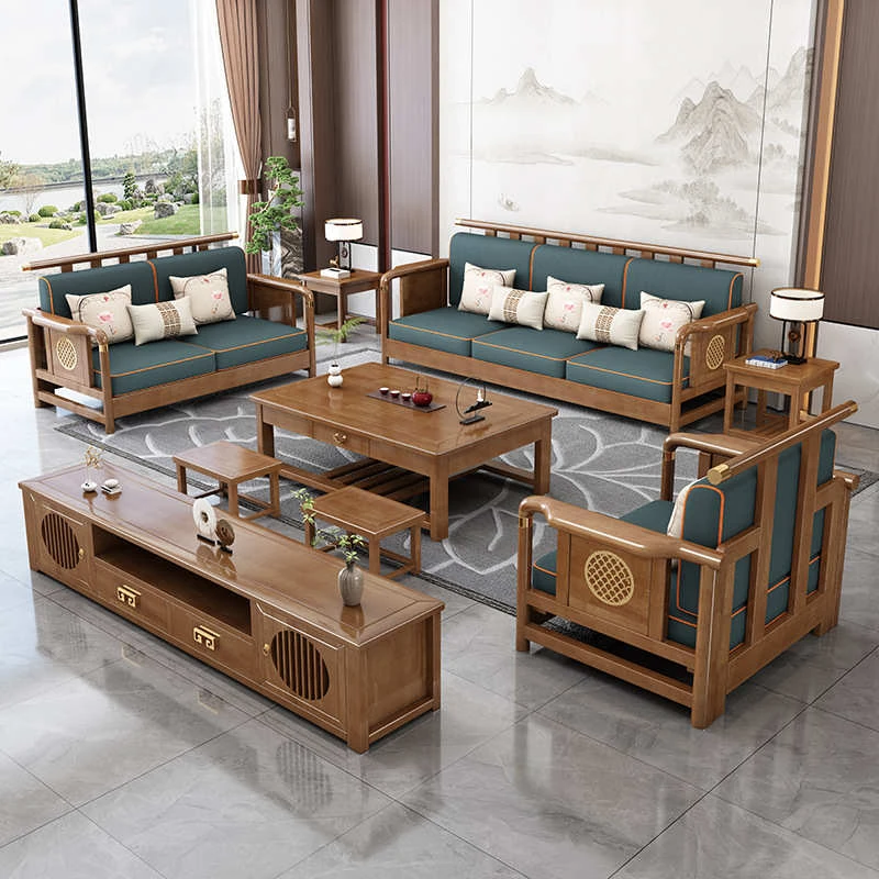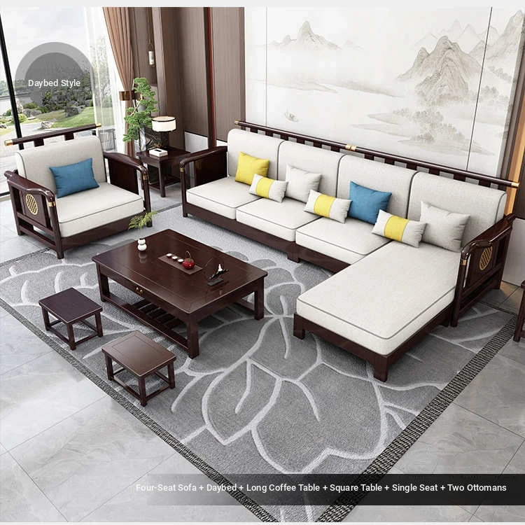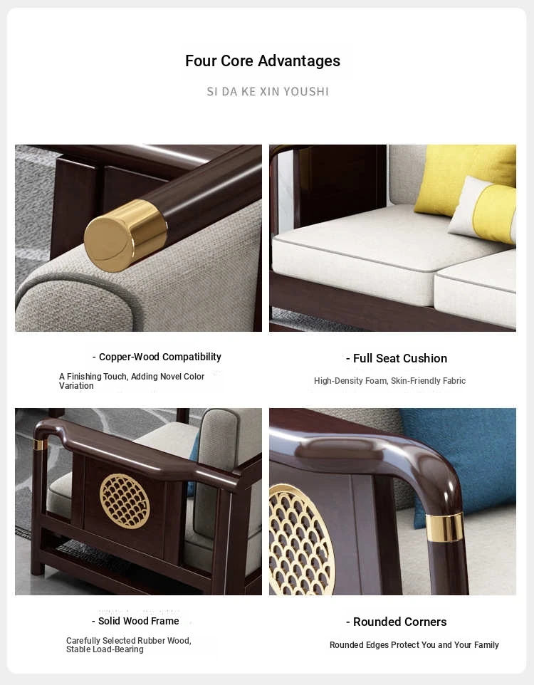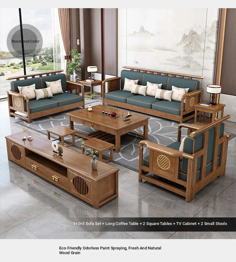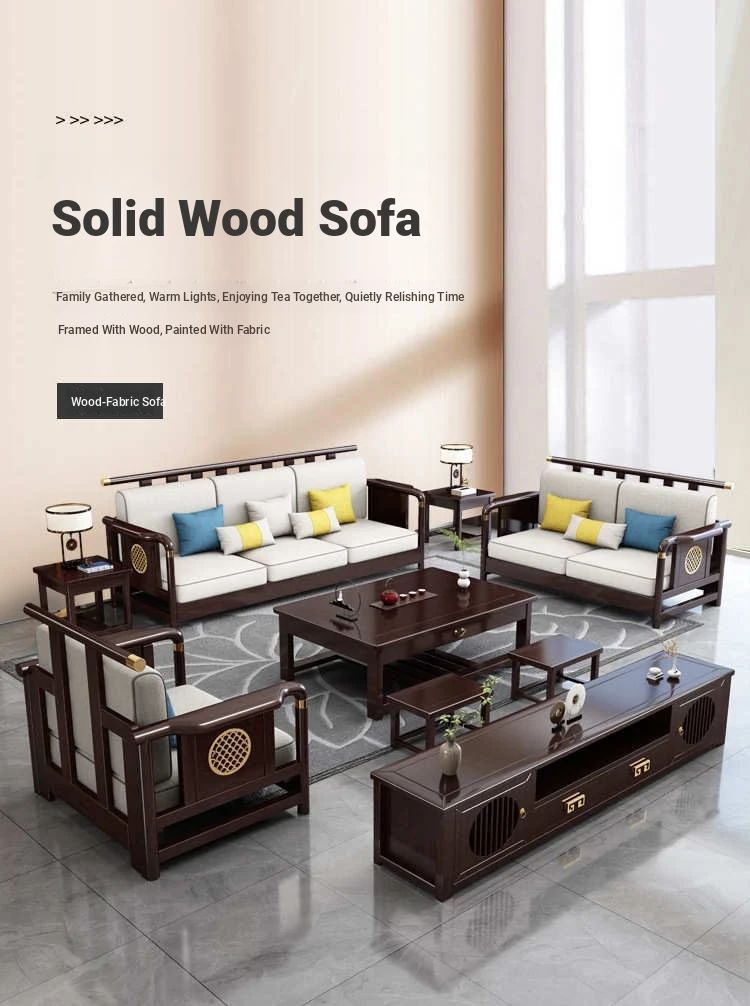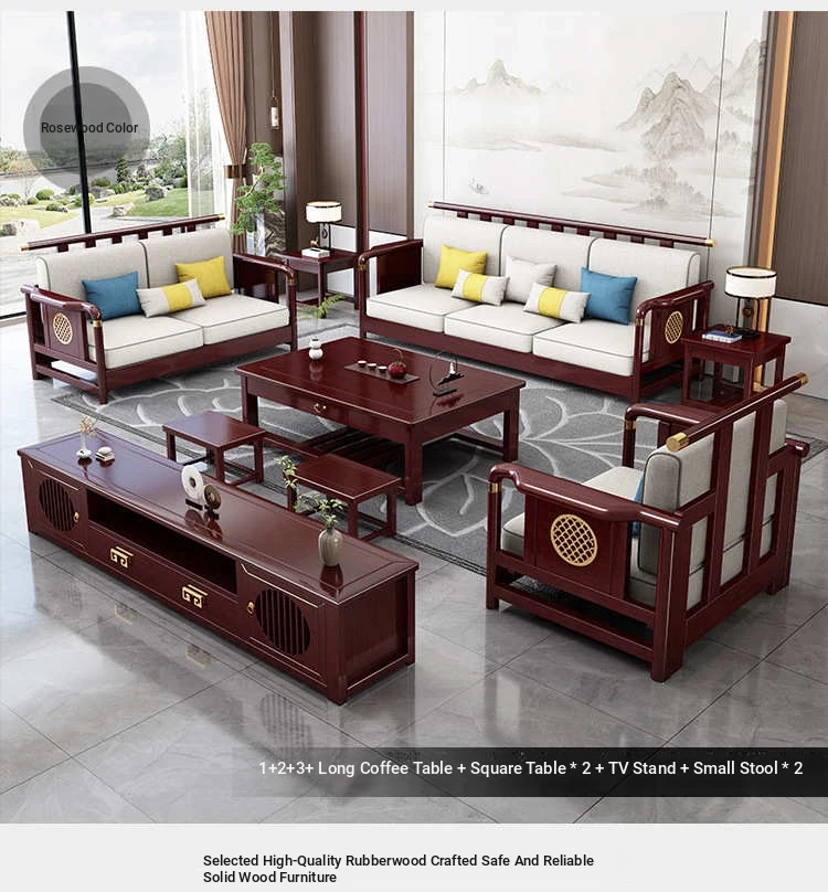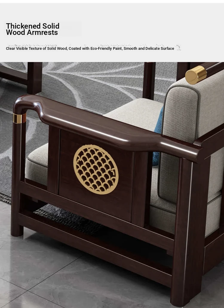 Solid Wood New Chinese Style Sofa for Rural Self-Built Homes - Three-Seater Compact Design, Perfect for Small Spaces, Made from Durable Rubber Wood, Embrace the Essence of Chinese Aesthetics in Your Home.