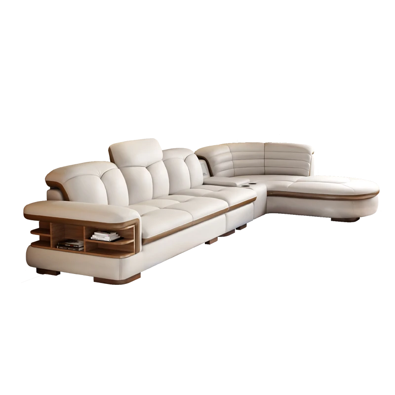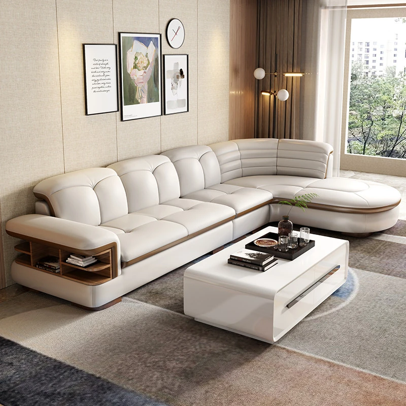 スマート本革ソファ 曲線デザイン リビングルーム用 コーナーコンビネーション 小型・中型住宅に最適なクリエイティブな異形デザイン 高品質な無垢材と牛革使用で、快適さとスタイルを両立!