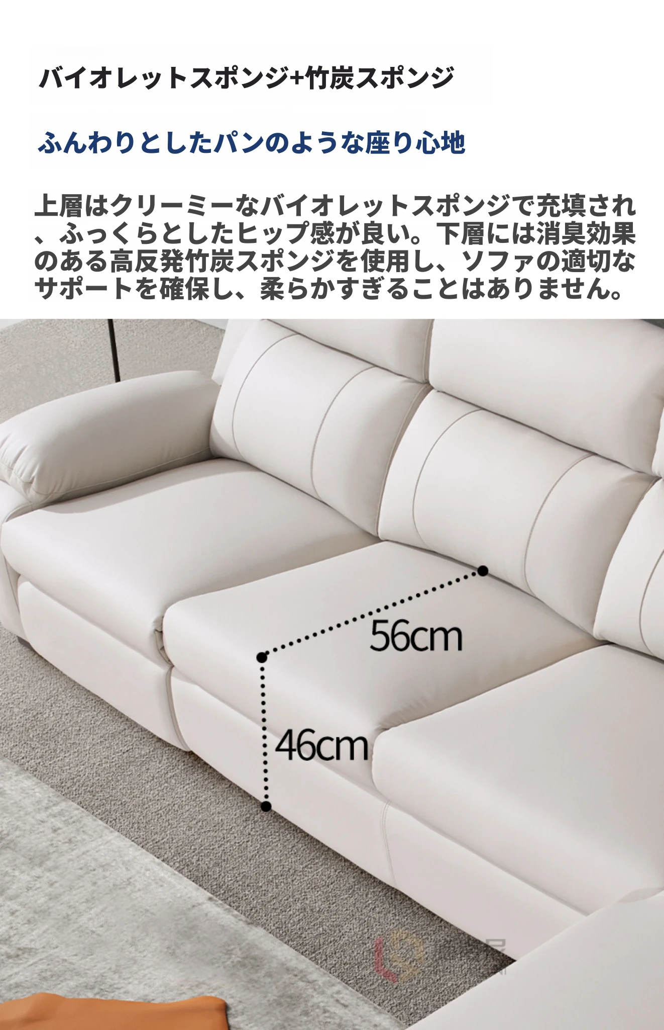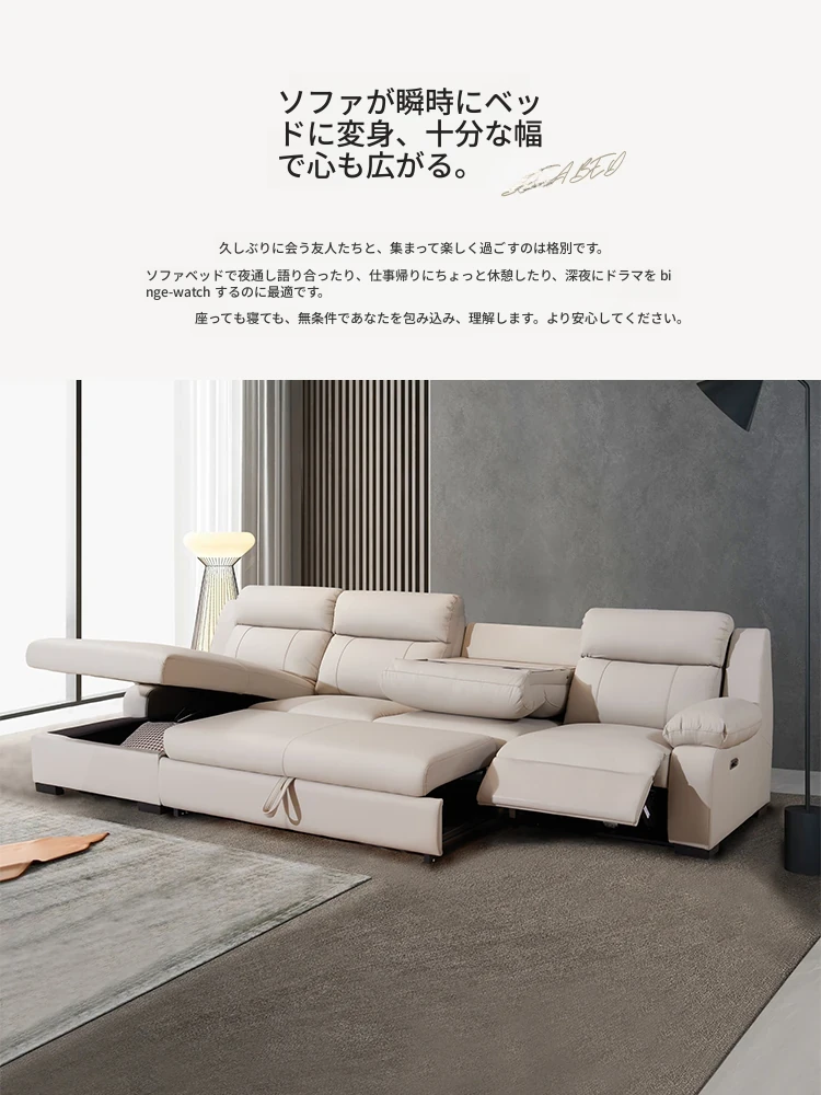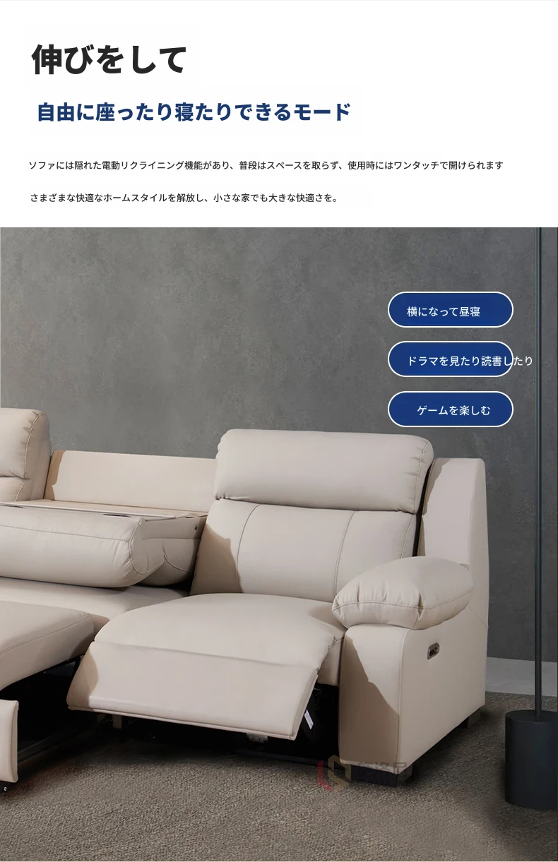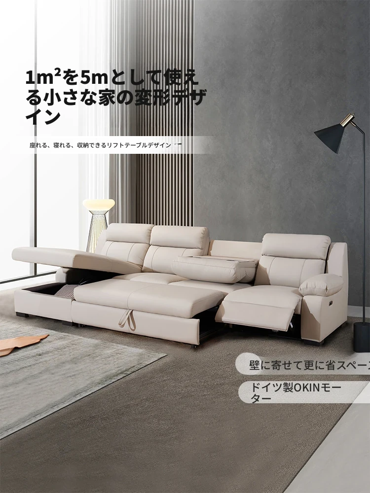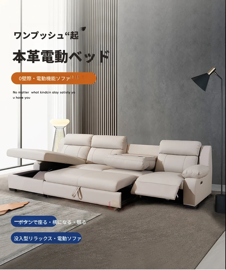 壁にぴったり寄せられる電動機能ソファ!真皮製の3人掛けカウチ、便利な収納スペース付き。リラックスできる宇宙船のようなデザインで、快適な睡眠もサポートするソファベッド。あなたのリビングに最適な選択です!