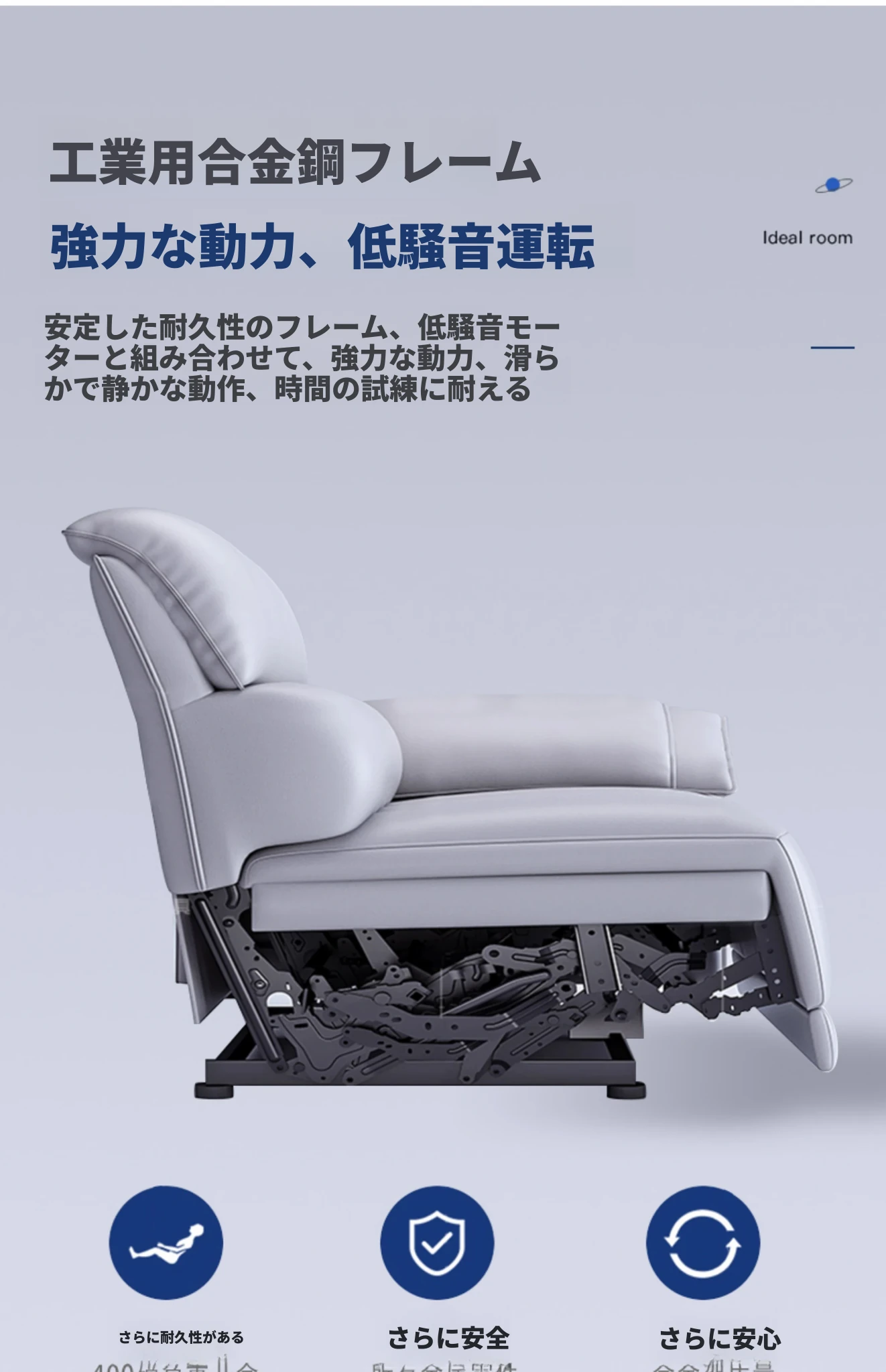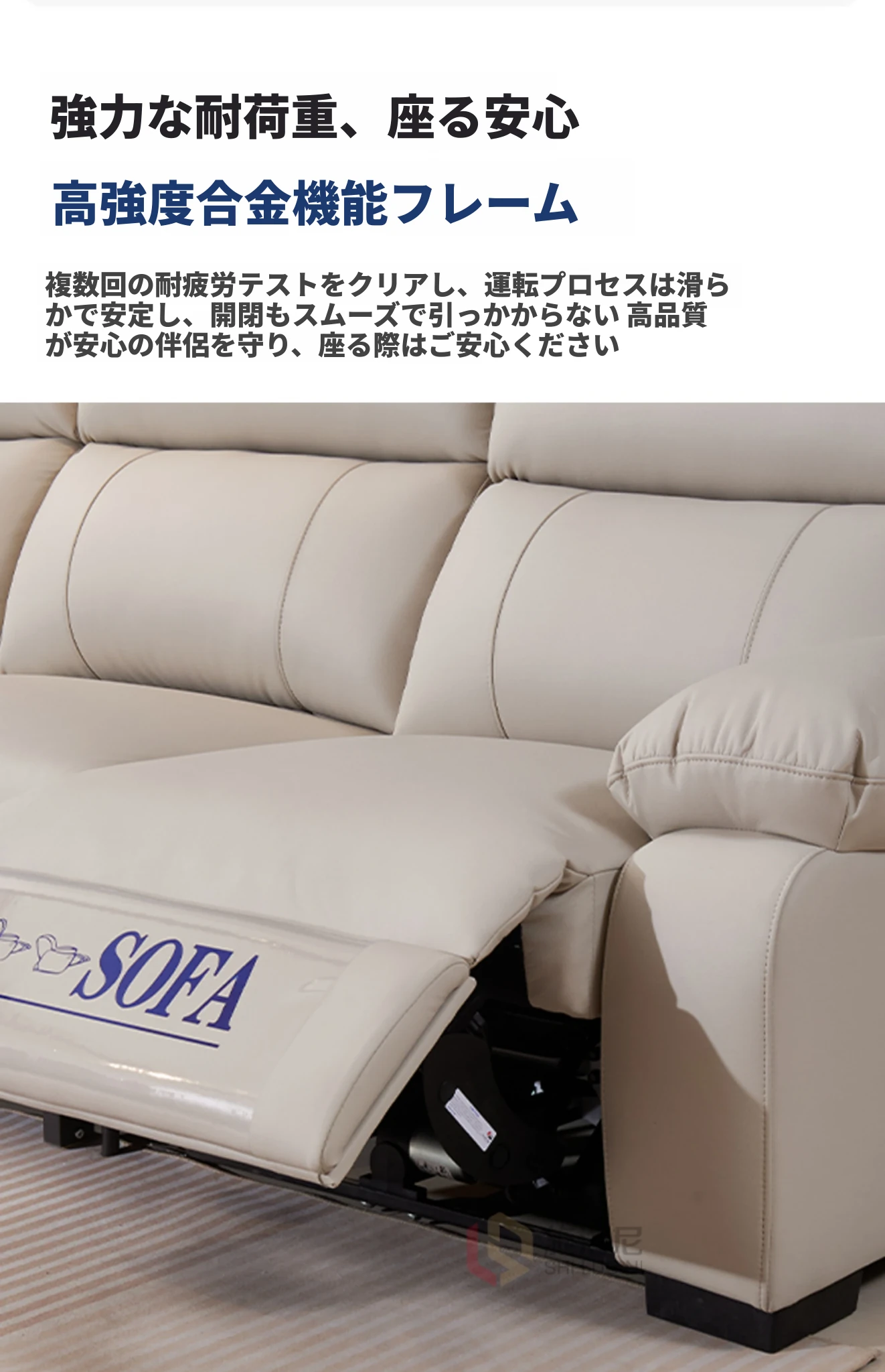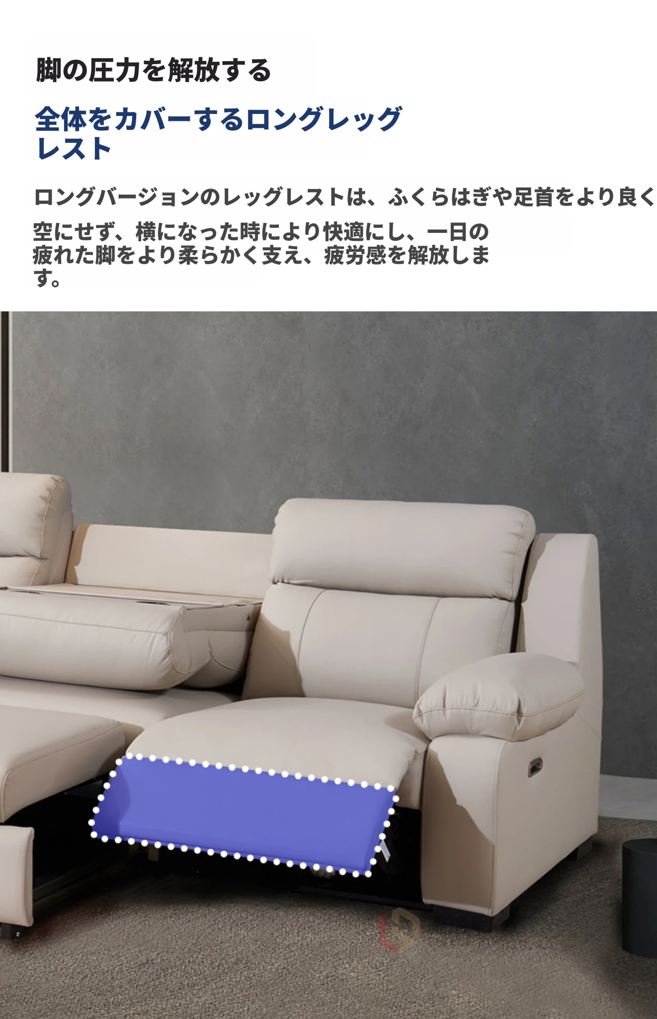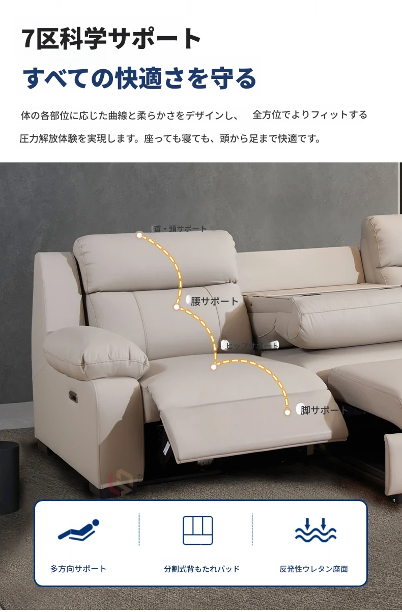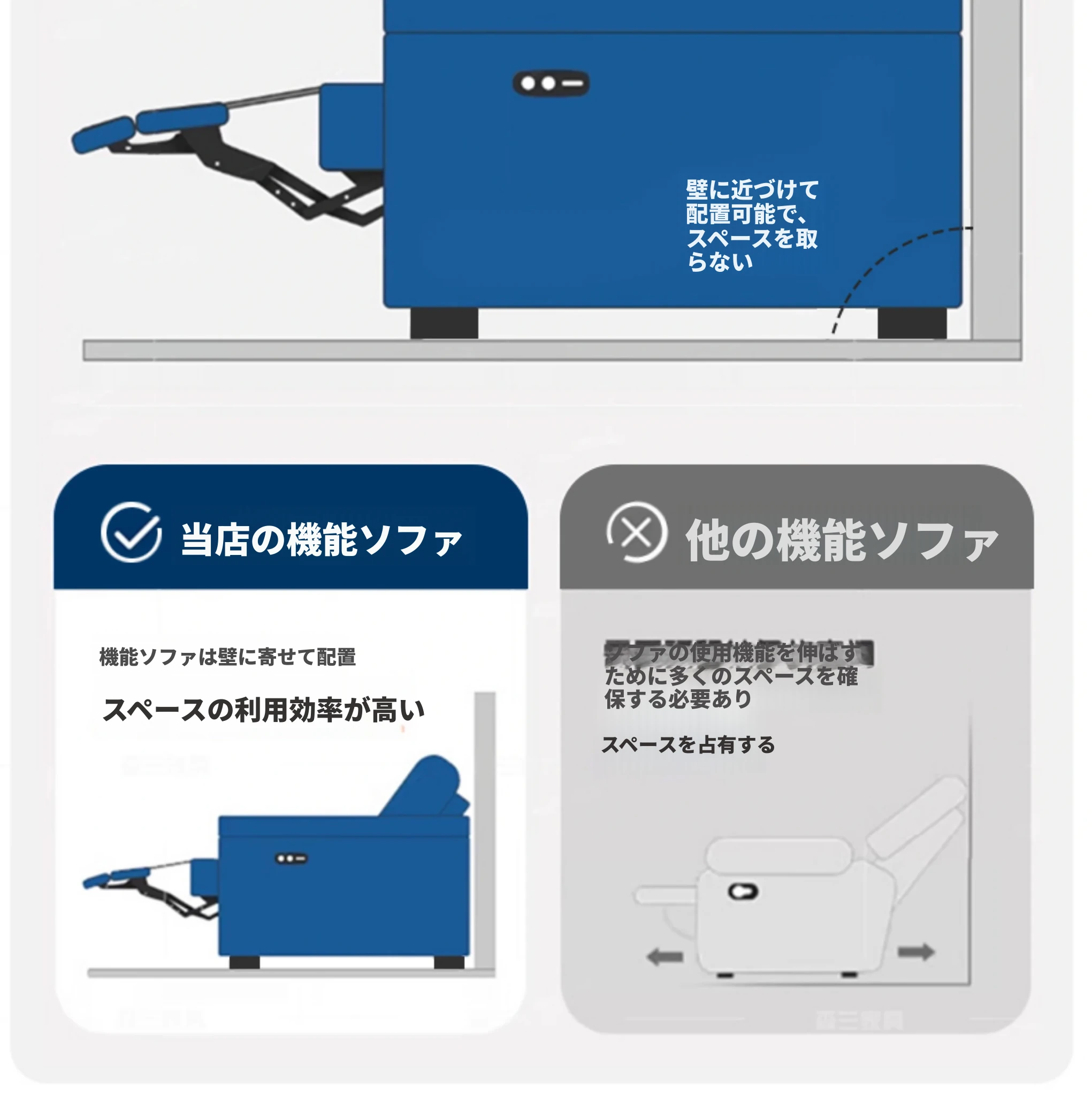 壁にぴったり寄せられる電動機能ソファ!真皮製の3人掛けカウチ、便利な収納スペース付き。リラックスできる宇宙船のようなデザインで、快適な睡眠もサポートするソファベッド。あなたのリビングに最適な選択です!