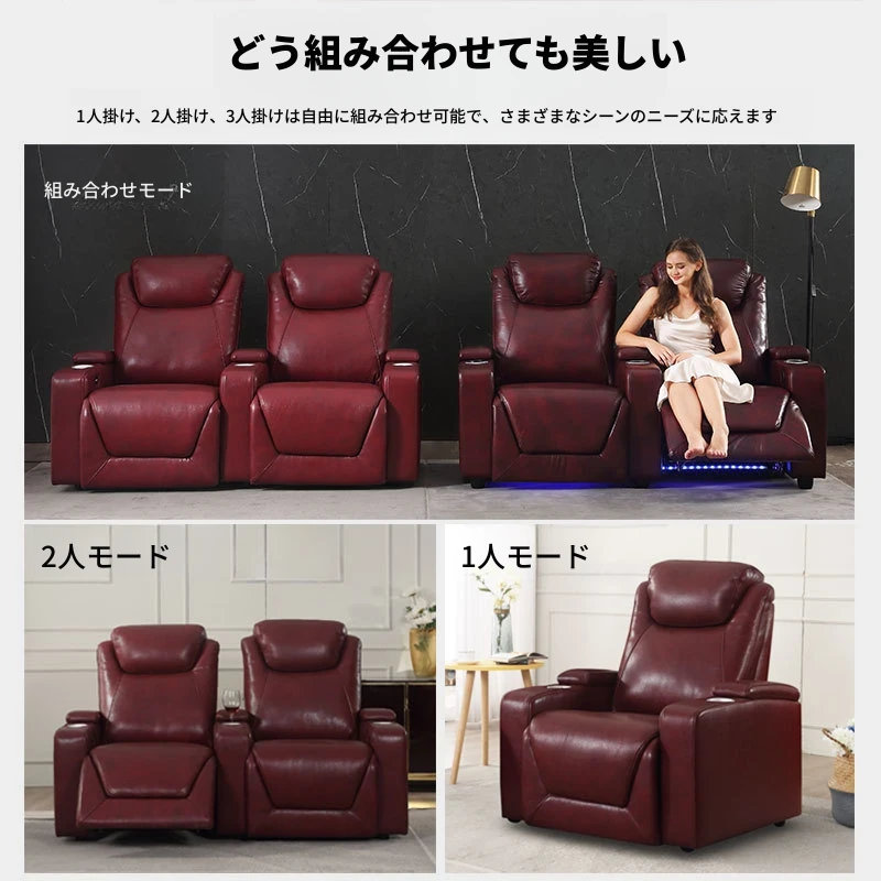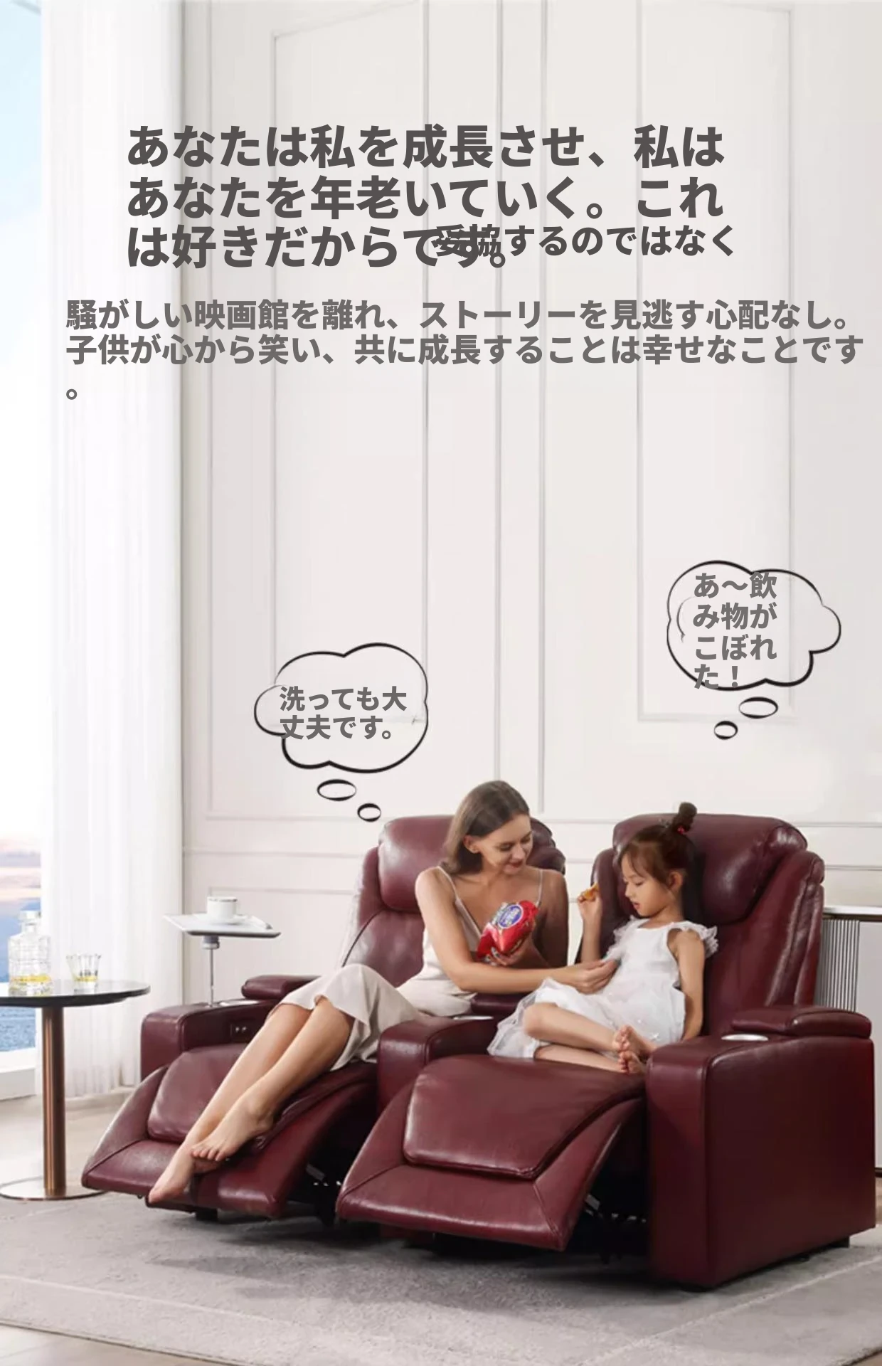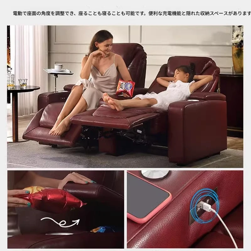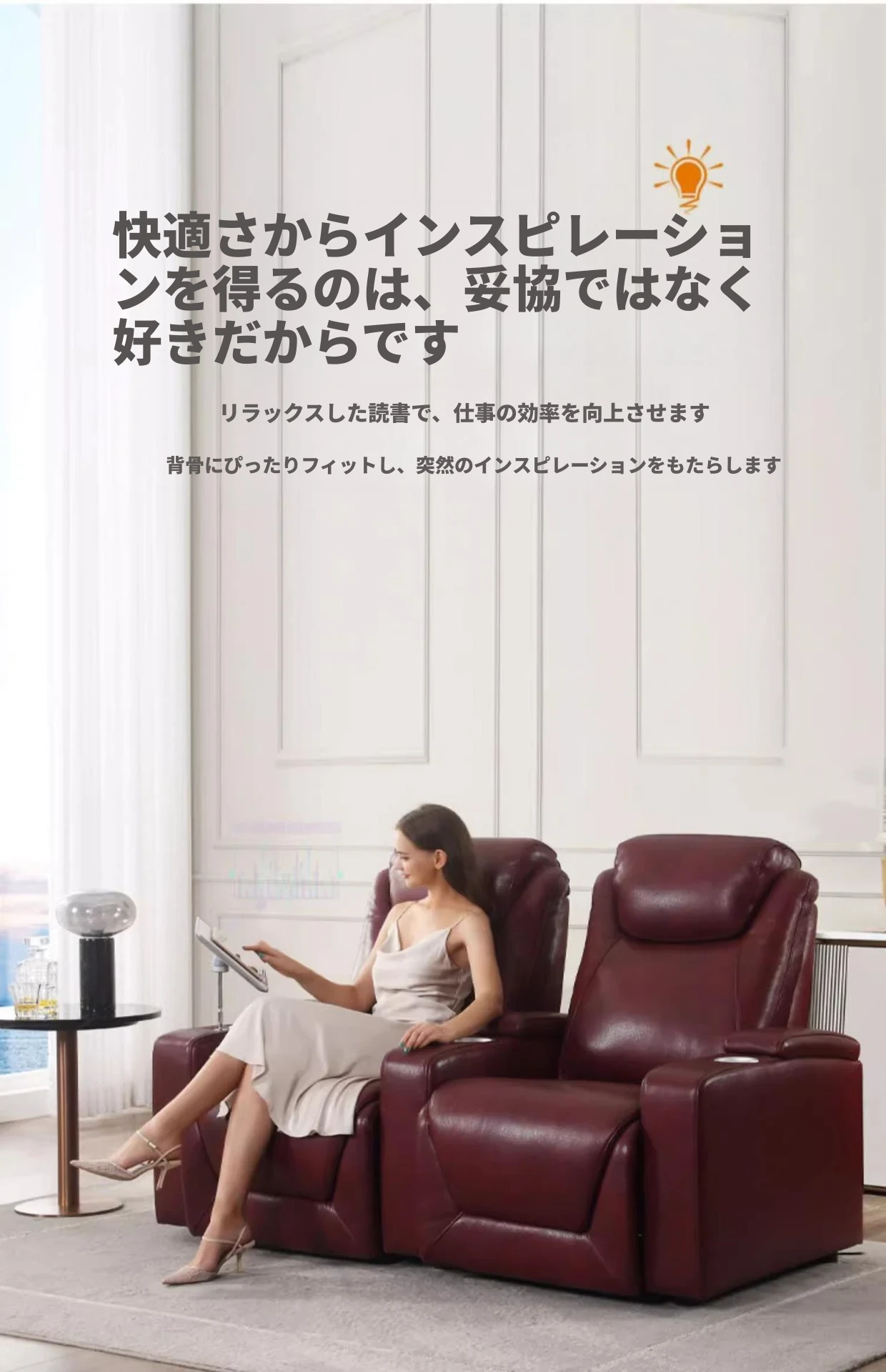 本物の別荘用リビングルームシアター、最高級の本革ソファ!一流の牛革使用、快適な電動機能付き。シングル&ダブル対応、贅沢な空間を演出します。