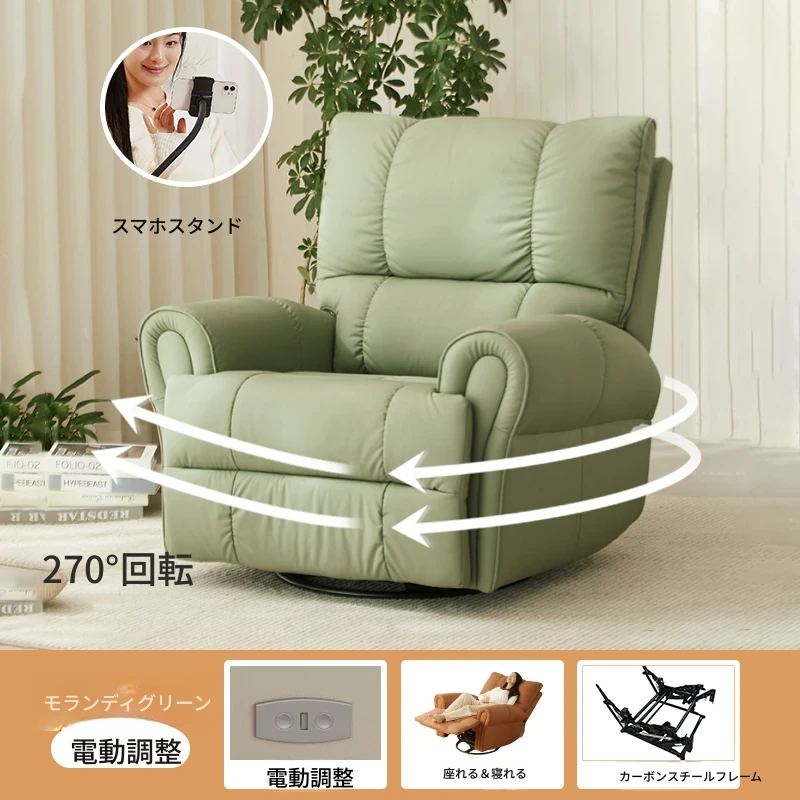 (モランディグリーン-キャットクラッチレザー)電動リクライニング+USB+回転+スマホスタンド