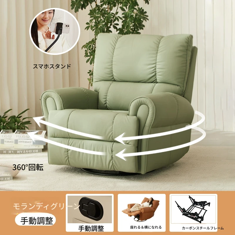 (モランディグリーン-キャットクラッチレザー)手動リクライニング+回転+スマホスタンド