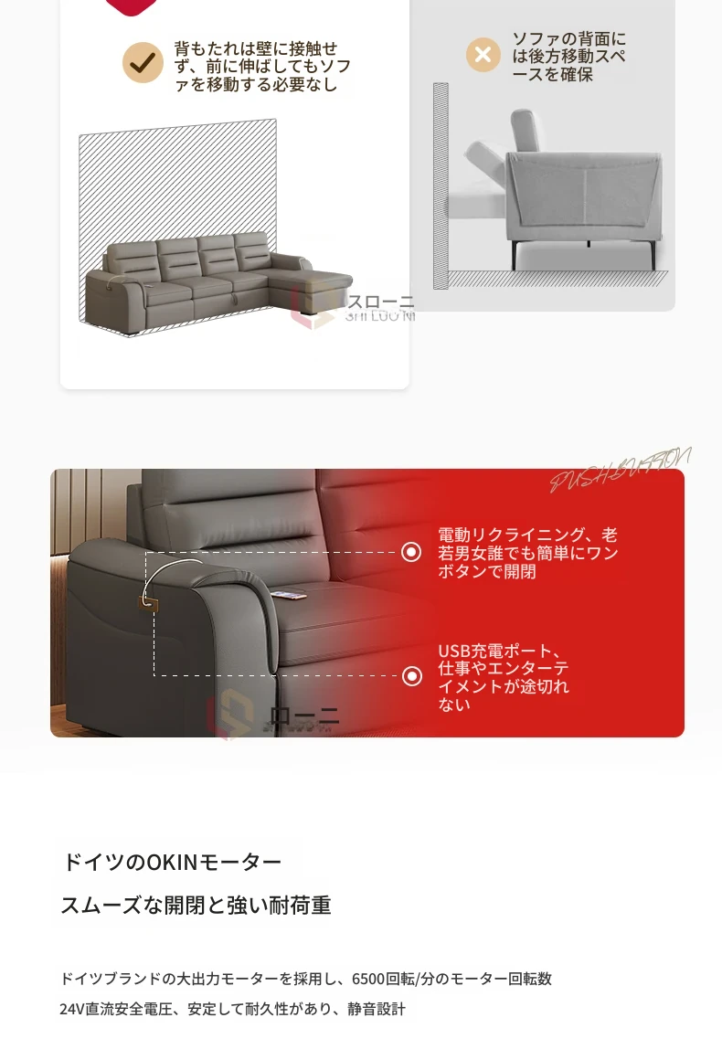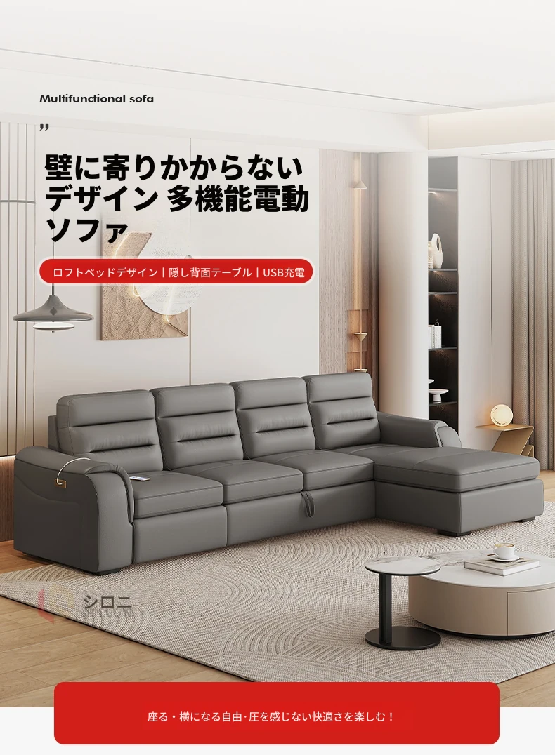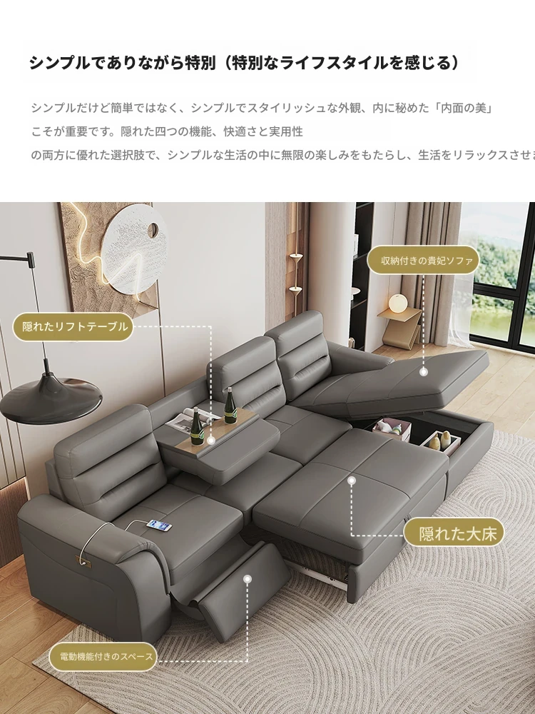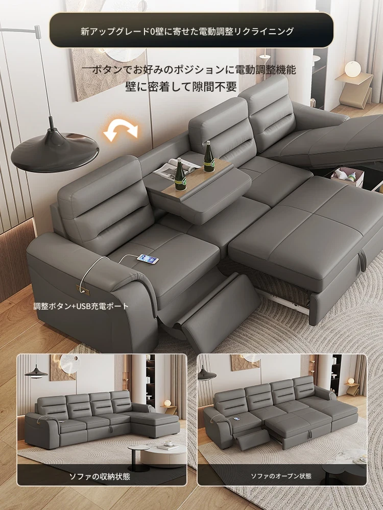 壁に寄りかからない電動機能ソファ!高級本革使用、贅沢なスペースカプセルデザイン。電動リクライニング機能付き、L字型の優雅なカウチベッド。快適な休息を提供する、まさに夢のソファ!