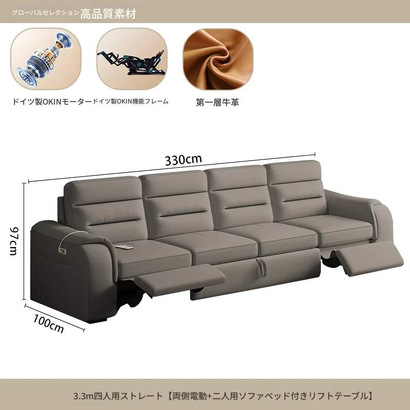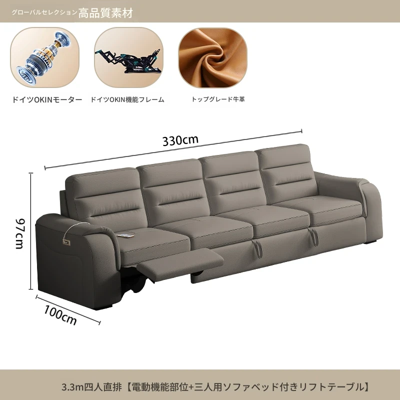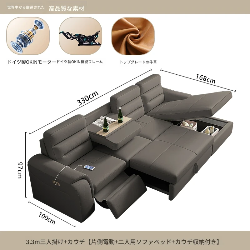3.3m三人+カウチ【片側電動+二人用スライドベッド付き背面リフターコーヒーテーブル+カウチ収納】