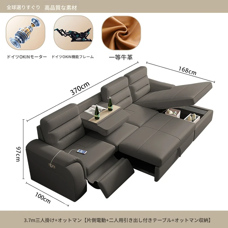 3.7m三人+カウチ【片側電動+二人用スライドベッド付き背面リフターコーヒーテーブル+カウチ収納】