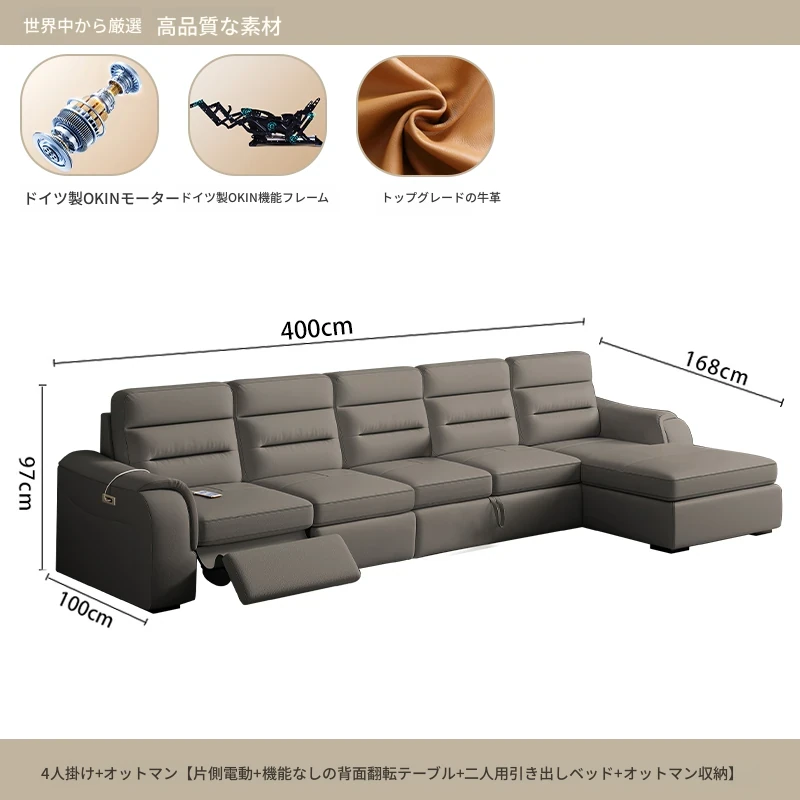 4m四人+カウチ【片側電動+無機能位置付き背面リフターコーヒーテーブル+二人用スライドベッド+カウチ収納】